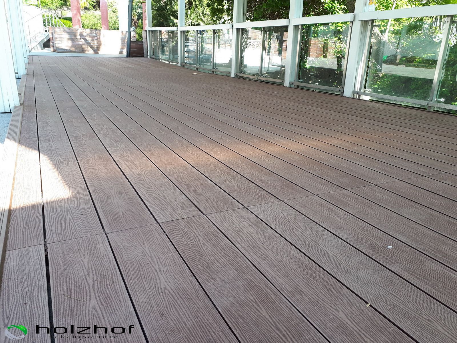 Именно по причине высокой проходимости и высокой нагрузки, для строительства смотровой площадки, необходимо применять только качественные и проверенные комплектующие, такие как: террасная доска Holzhof (коричневого цвета) на основе полиэтилена с глубоким 3D тиснением, которая и стала настоящим украшением пола. Также была применена высокопрочная Лага из ДПК с двумя ребрами жесткости и, конечно же, современная 3D клипса HILST.